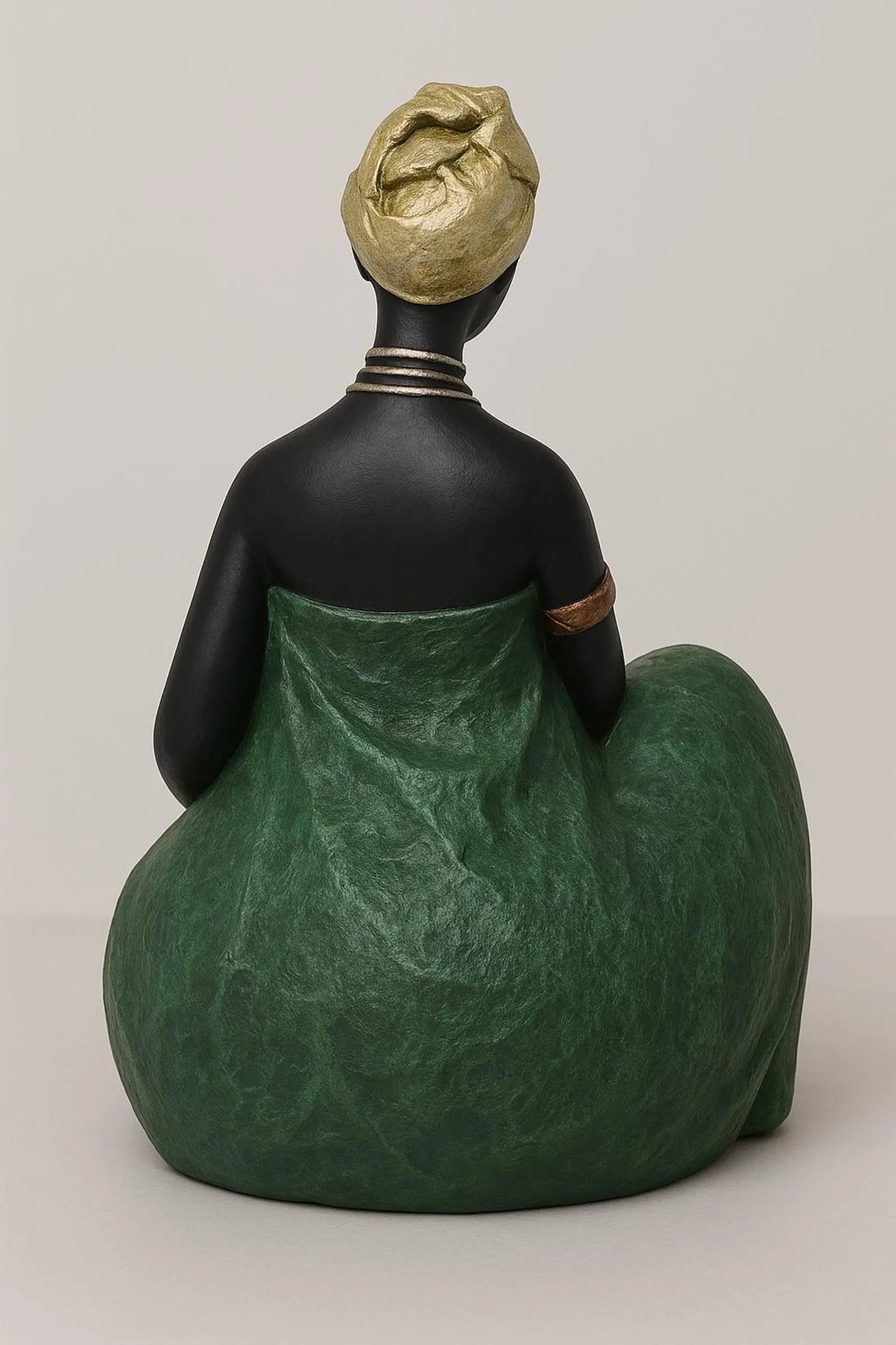 Dressed in a flowing emerald green gown and finished with a golden headwrap, this figurine represents dignity, balance, and inner power. Every detail reflects African tradition and feminine elegance, making it a meaningful decorative piece rather than just an ornament.